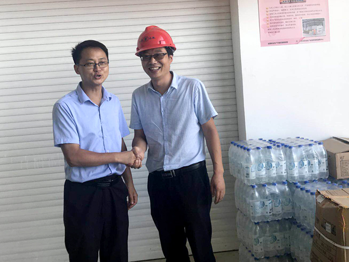 2018年7月17日,扬州广陵经济开发区汪卫锋主任带队到水机世俱杯网页版登录入口进行 “送清凉”慰问,送来了毛巾、盐汽水、清凉油等防暑降温物品,并给现场人员发放了《工贸安全手册》。水建世俱杯网页版登录入口监事会主席、纪委书记黄祥圣、总经理助理杨红霞等参加活动。