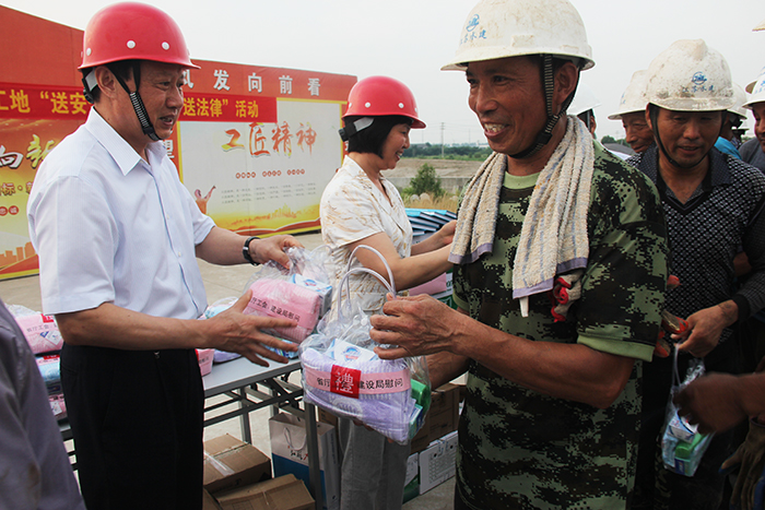 汤超一行先后来到由我世俱杯网页版登录入口承建的新孟河界牌水利枢纽、扬州市瓜州泵站工程现场,看望和慰问坚守在工程一线的建设者,将防暑降温用品等送到一线职工手中,同时赠送了《安全生产法》《水利安全生产标准化指导手册》《建筑工人劳动防护手册》等安全生产法律法规和书籍。座谈过程中,汤超听取了工程建设管理情况的汇报,详细了解了一线职工的作息时间、工作强度、饮食卫生、住宿条件及现场防暑降温措施落实等情况,要求项目部合理安排职工作息时间,开展轮换作业,适当增加休息时间、减轻劳动强度,做好职工饮水、饮食卫生和防暑降温等工作。