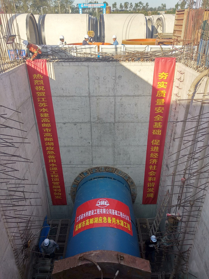 该工程是高邮市饮用水应急备用水源,是提高区域供水安全保障水平的一项重大民生工程。工程在高邮湖新建取水口、接收井、工作栈桥、配套防洪控制闸首;穿越京杭运河布设DN2400的JPCCP预应力钢筒混凝土顶管775米,竖曲线半径8000米,管道穿越大运河两道二级堤防和高邮湖侧一级堤防,大运河底管道埋深10.3米。在京杭运河东侧新建工作井、配套集水井及输水泵站、管理用房;铺设至高邮市第二水厂的PCCP输水管道7.286公里。