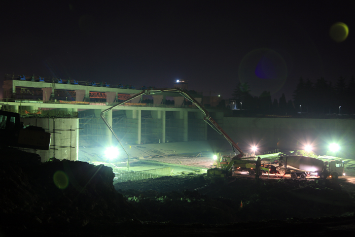 “下一步我们将集中精力完成最后一块消力池浇筑,翼墙墙后回填土填筑,补齐上下游护坡护底,以及加紧进行闸门、启闭机和小水电电机安装调试,预计到5月20日可基本完成全部水下工程,为提前实现通水验收目标创造有利条件。”项目经理李新海告诉记者。记者注意到,李经理黝黑的脸庞上充满着自信的笑容。而在项目总工周海银心里更有一笔帐:“泗阳闸工程从正式开工到现在,3个多月时间,拆掉一座老闸,新建了一座7孔(孔宽10m)的节制闸和两孔小水电,完成砼近30000方。高峰期投入近500号人,模板近20000平方米,钢管900余吨,扣件10多万只。人员和周转材料的投入是类似正常工程的两倍以上。近一个多月来,工作面全面打开后,每天都是两台以上泵车在浇筑混凝土,连续有上百个小时的浇筑强度。”超常规的投入保证了抢工的需要,但大量的人力物力带来的是工程更周密的计划、更繁琐的安排、更严格的考核。项目部两天一次生产会,主要管理人员每天至少一次碰头会,一切都按计划有条不紊的进行。所有人员都按照计划按时按点的坚守岗位,只能提前,不能落下,特殊部位调整时必须把时间再抢回来。