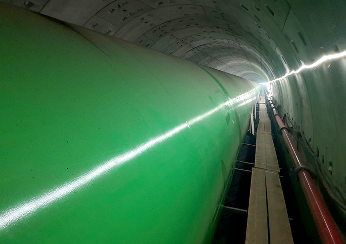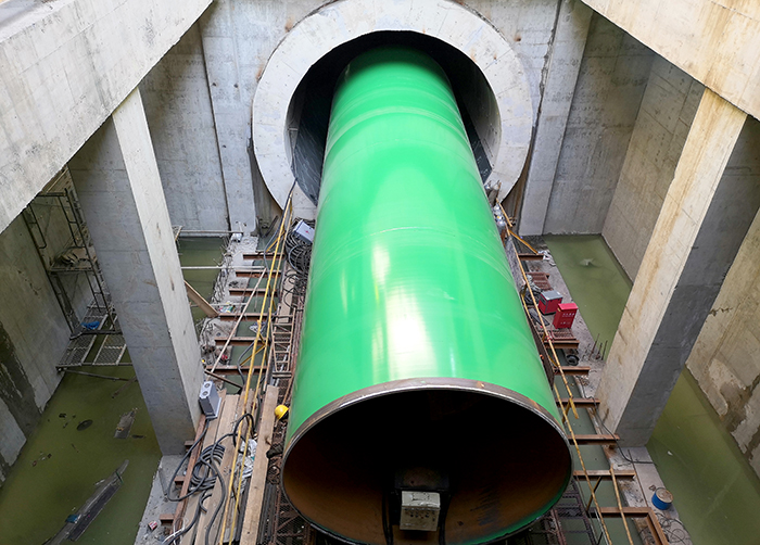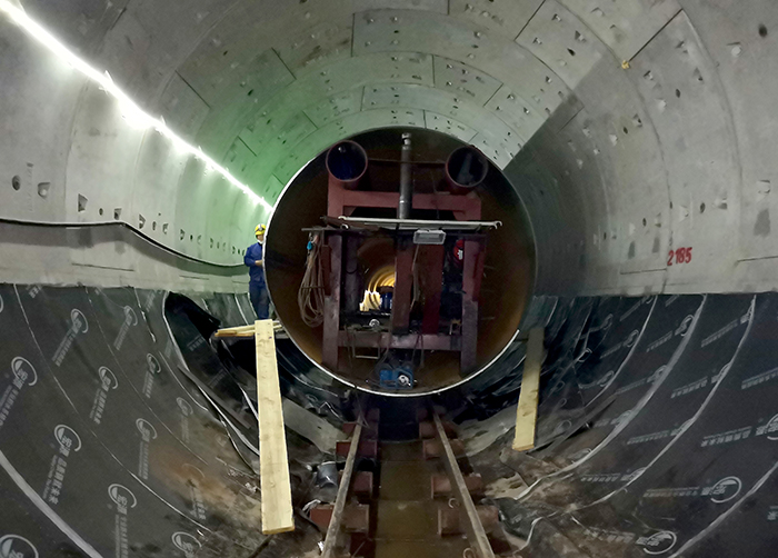 施工过程中遇到了诸多难以想像的困难——工程要在受限的隧道空间进行重达31吨的钢管运输安装,常规施工设备根本无法施展;项目部人员缺少隧道施工经验,缺少专业施工设备,没有现成的施工方法借鉴。在世俱杯网页版登录入口强有力的支持下,项目部技术人员广开思路,开展技术攻关。他们对大口径钢管运输、对口等设备进行创新设计,并不断进行优化改进,确保了钢管安装的顺利推进。