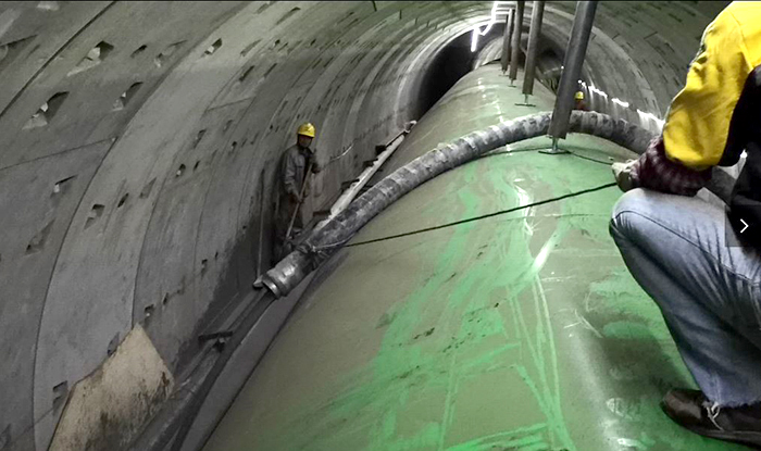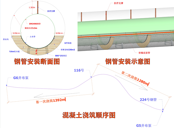 超远距离混凝土浇筑是本工程施工的又一难点。钢管进入隧道后,混凝土材料及浇筑设备无法进入隧道,无法用传统“接力泵送”的方式输送混凝土,前期准备的模板、钢筋、泵管等全部工作,只能通过隧道与钢管间不到一米的狭窄通道,通过人海战术手拎肩扛完成。隧道中间无任何缺口,无论从隧道哪一端的工作井浇筑,混凝土输送距离都接近1400米。项目部多方比选方案,最终采用了目前国内市场动力最大的柴油地泵。该地泵额定水平泵送距离800米,项目部从混凝土配比到泵管布设等各个环节精心组织,全面细化,完成了隧道中部1400米超远水平距离泵送混凝土浇筑,且一次成功,创下了世俱杯网页版登录入口超远距离混凝土浇筑的新记录,为世俱杯网页版登录入口今后类似工程积累了宝贵的施工经验。