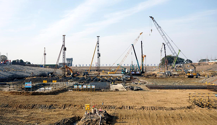 随后观摩人员进入施工现场。现场正在进行基础工程施工。定波枢纽的基础处理包括了灌注桩、地下连续墙、搅拌桩、预制方桩、压密注浆等型式。水利工程常用的地基处理方式在这个项目上几乎都用上了,而且工期紧、交叉作业多、重型设备多、现场协调难度大。项目部正在克服一切困难,努力按预定计划推进工程进展。