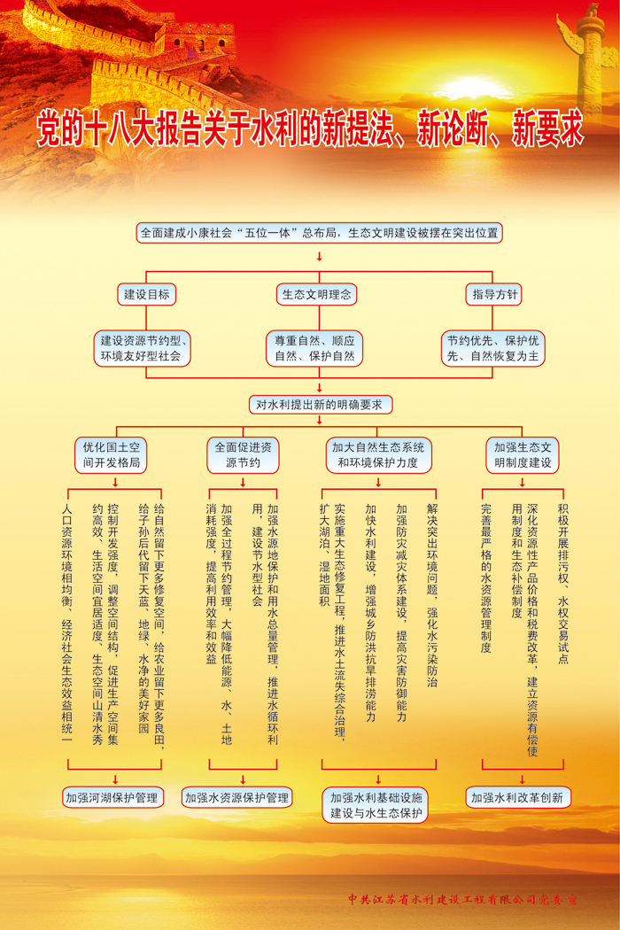 针对江苏省水利改革发展和现代化建设的伟大实践,宣传牌围绕2011年中央和省委一号文件的战略部署,以奋力开启江苏水利现代化新征程为统揽,对水利现代化建设的指导思想、发展目标、总体布局与主要任务、实施方案、保障措施等提出了具体要求,构建出清晰明朗的发展目标和实施规划。
