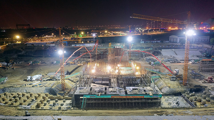 4月9日夜晚9时许,定波水利枢纽工程工地上灯火通明,挖机有序作业,工程车出入繁忙,塔吊不停地调运施工材料,工人们穿梭于钢筋网、脚手架中,呈现出抢工大干热潮,这样的场景几乎每天都在重复着。