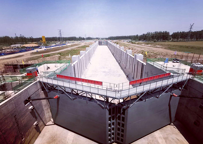 陆运河船闸工程于2017618日正式开工,121日完成第一节闸室底板浇筑,2020425日完成闸室及上下闸首所有二期砼浇筑,513日完成闸门及启闭机安装调试,515日完成征地范围内水下工程,具备水下已完工程质量鉴定条件。