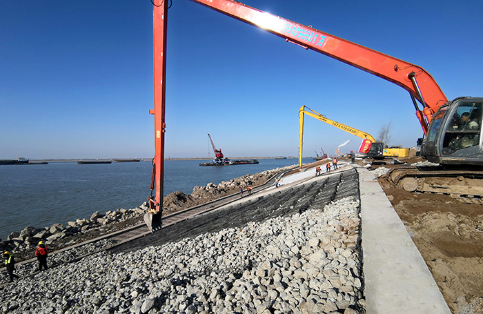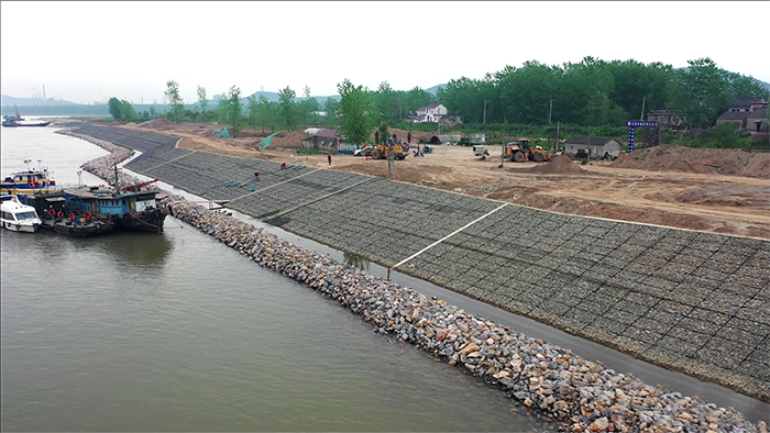 至2021年7月2日,随着最后一斗块石抛投入水,工程合同内工程量全部优质、高效、安全完成。工程累计完成水下散抛石21万方,赛克格宾石笼1.5万方,浇筑砼6600方,雷诺护垫护坡3500米,铰链排7.2万平方,生态放养鱼苗1080万尾。