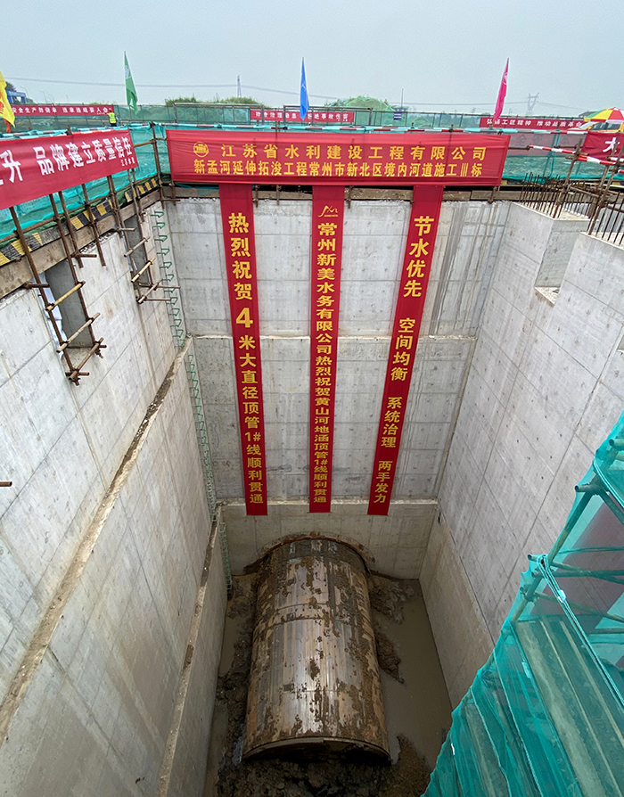9月5日上午8时48分,新孟河延伸拓浚工程常州市新北区河道施工III标黄山河立交地涵4米大直径曲线顶管1#线顺利贯通,省太湖治理工程局、常州市新北区水利局、常州市新美水务有限世俱杯网页版登录入口等单位领导、世俱杯网页版登录入口杨斌总经理等参加了贯通仪式。